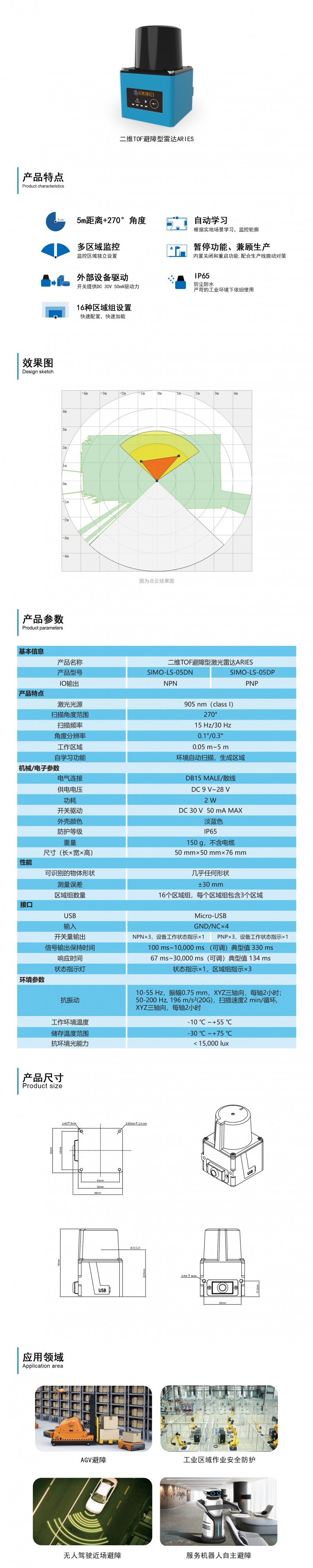 ARIES避障型激光雷達是星秒繼導航型雷達后研制出的一款用于服務機器人、智能工廠區域安全防護領域等避障型雷達。它可實現5m距離,270°角度,多區域監控獨立設置,16種區域組設置可快速配置,快速加載;還可根據實地場景自動學習,監控輪廓;內置關閉和重啟功能,配合生產線搬動對策;防護等級IP65,即使在嚴苛的工業環境下依舊適用。