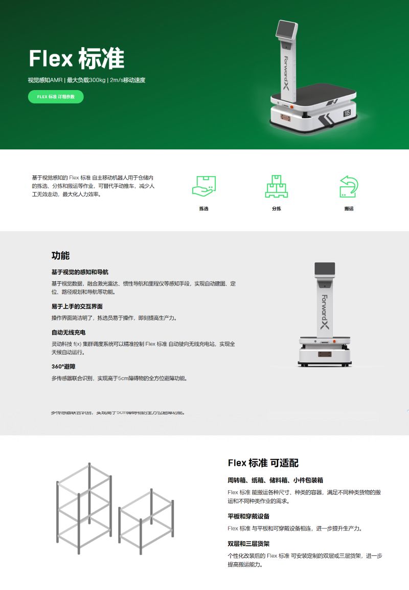 基于視覺感知的 Flex 標(biāo)準(zhǔn) 自主移動(dòng)機(jī)器人用于倉(cāng)儲(chǔ)內(nèi)的揀選、分揀和搬運(yùn)等作業(yè),可替代手動(dòng)推車,減少人工無效走動(dòng),最大化人力效率。