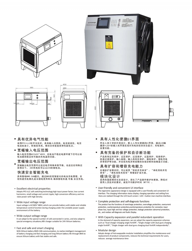 觸摸屏智能操作設計:告別傳統按鍵方式,給您帶來更現代更具科技智能的操作體驗 自動充電:插槍自動充電,簡化充電流程,便于操作 兼容性高:80V200A兼容48V200A充電 多重保護: 輸出短路,過流過壓保護,反接保護,電流導管保護等多重保護 預約充電功能:避開高峰用電時段,有效節省成本 雙語切換:中英文雙語隨需切換,跨越語言障礙,與世界接軌 人性化設計:充電機背板內部附部件明細及產品接線圖,方便客戶可更清楚的了解產品,便于維修,提高售后時效 獨特設計: 內置電磁鎖驅動模塊,防止臨時斷電鎖槍 使用壽命更長:功率模塊預留20%空間,提高模塊的使用壽命 出色內部結構: 內部結構左右出風,內部電路不容易積粉塵,提高充電機壽命