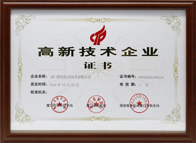 | 發(fā)證機(jī)構(gòu): | 廈門市科學(xué)技術(shù)局/廈門市財(cái)政局/國(guó)家稅務(wù)總局廈門市稅務(wù)局 | 發(fā)證時(shí)間 : | 2020-10-21 |