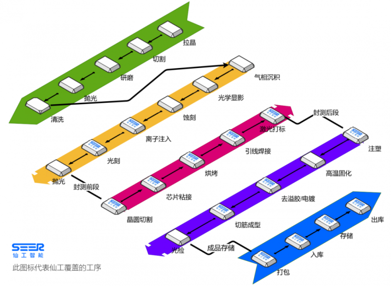仙工智能經(jīng)過多年的耕耘,已經(jīng)覆蓋了半導(dǎo)體行業(yè)制程工序的絕大部分工序,從 IC 制造到 IC 封測的工序間物料到成品和原材料的存儲和出入庫等傳統(tǒng)物流工序都有覆蓋。今天分享的就是其中的晶圓處理制程。