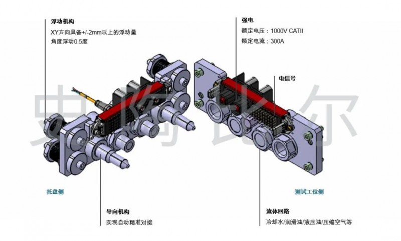 然而,由于在自動測試線上,采用單回路分別連接極其低效且易出錯,與自動測試快節奏和低容錯的要求不能完美適配,因此能將多回路(包括水、油、氣、電)一次性集中連接的組合連接器也就成為了自動測試線上的剛需產品——即將電驅動上的強電、信號、冷卻液、潤滑油等回路集中連接至“托盤快速連接器”,“托盤快速連接器”與各測試工位側的“臺架連接器”自動對接,保障回轉式自動測試線體順利運行。