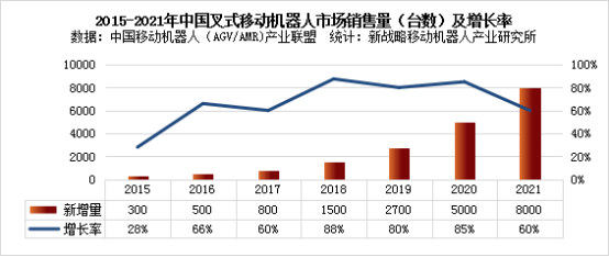 據中國移動機器人(AGV/AMR)產業(yè)聯(lián)盟數據、新戰(zhàn)略移動機器人產業(yè)研究所統(tǒng)計,2021年中國叉式移動機器人(含視覺導航)銷量達8000臺,同比增長60%,市場規(guī)模約為24.5億元,同比增長42.40%。