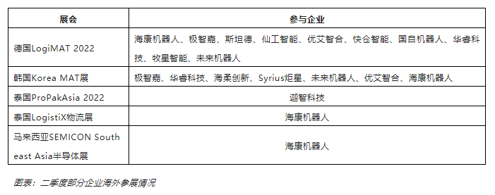 二季度,海外比較受關注的展會如德國LogiMAT 2022及韓國Korea MAT展都吸引了不少國內企業的參與,如??禉C器人、極智嘉、斯坦德、仙工智能、優艾智合、快倉智能、國自機器人、華??萍肌⒛列侵悄艿?,都攜旗下代表性產品及方案一一亮相。