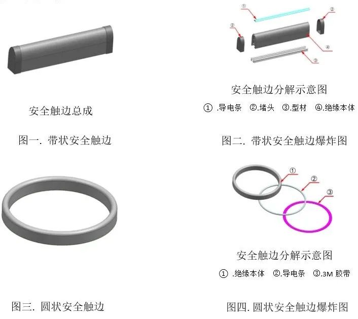 沃美諾方面介紹,以往安全觸邊大多以帶狀(見圖一,圖二)或圓狀 (圖三,圖四)安裝在升降機、安全門、機床工作臺、自動無人小車、物流AGV小車、輪胎成型機等存在擠壓或剪切危險的移動部件邊棱上,安全觸邊被壓迫后傳遞信號給動力源以停止部件運動。