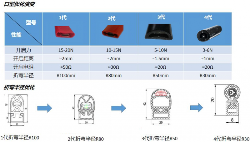 經過公司多次試驗,其安全觸邊有了新的突破:安全觸邊折彎半徑(折彎半徑一般指的是最小折彎半徑,指在性能正常使用的情況下所能彎曲半徑的最小半徑)由第三代折彎半徑R50提升至第四代R30,同時膠條防夾范圍也由此前的防夾90°改進提升至180°(見圖八),實際應用場景實現了無死角的防夾,安全觸邊的改進大大減小了移動部件對被撞擊者的傷害。