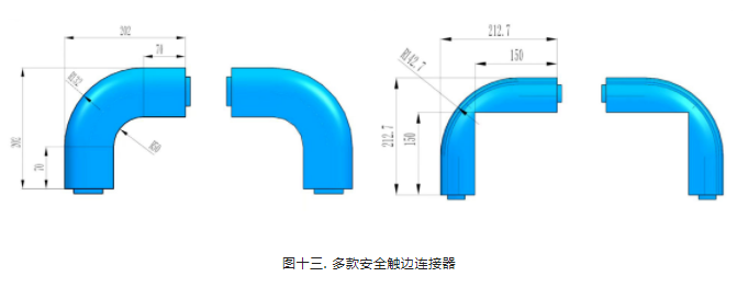 同時為了和客戶移動部件更好地配合組裝安全觸邊,沃美諾一次性開發了多款口型安全觸邊連接器(用的比較多的兩款口型見圖十二);以配合內圓角分類,可分為直角連接器,R50連接器及R80連接器(見圖十三)。當這三種連接器都無法達到客戶的完美要求時,沃美諾還可根據客戶提供的安全觸邊安裝區域數據進行個性化定制。