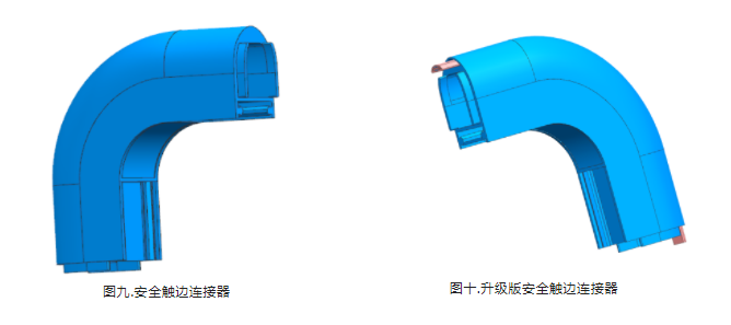 同時安全觸邊連接器由原來的整個轉角盲區(連接器中間無法穿入導電條,見圖九)提升到了現在的升級版安全觸邊連接器(見圖十);升級后的安全觸邊完全消除盲區的也將兩側導電條連接了起來,同時也提升了整體外觀的美觀度。