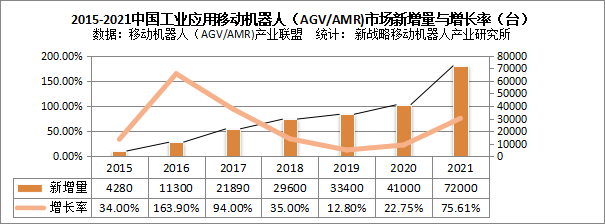2015-2021中國市場企業(yè)工業(yè)應用移動機器人(AGV/AMR)新增量(臺)與增長率