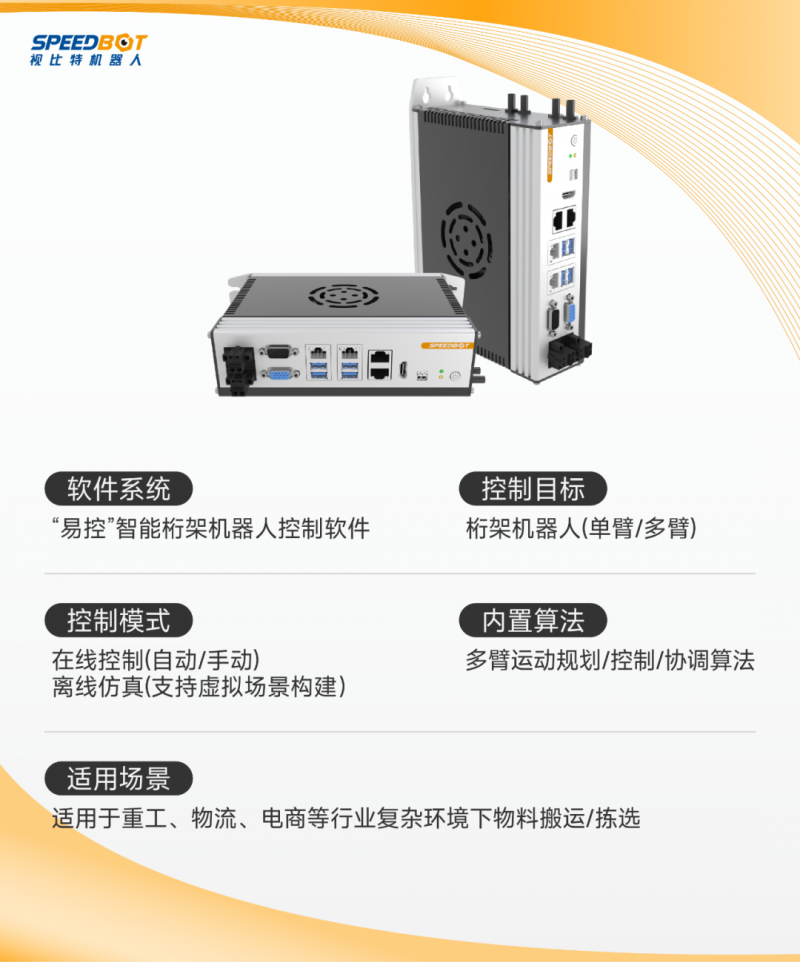 針對以上亟待解決的難點,視比特機(jī)器人推出了國內(nèi)首款多臂智能桁架機(jī)器人控制器——SpeedTruss,以最優(yōu)運動規(guī)劃突破傳統(tǒng)桁架自由度限制,實現(xiàn)了多臂共軸桁架機(jī)器人在復(fù)雜環(huán)境、復(fù)雜任務(wù)下的自動規(guī)劃、主動避障、敏捷執(zhí)行,適應(yīng)全場景柔性生產(chǎn)需求;同時支持低代碼靈活開發(fā),極大地簡化了開發(fā)流程,大幅縮短了投產(chǎn)周期,為工廠智能化水平和生產(chǎn)效率的提升帶來質(zhì)的飛躍。