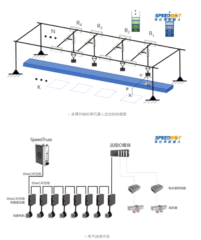 SpeedTruss智能桁架控制器主要用于多臂共軸桁架機(jī)器人(N≥1)的運動控制,運用自主研發(fā)的桁架運動規(guī)劃、多臂協(xié)同運動控制、無碰運動協(xié)調(diào)等算法技術(shù),為智能產(chǎn)線提供靈活、精準(zhǔn)、高效的多臂桁架運動控制方案。用戶只需調(diào)用控制器提供的高級任務(wù)指令接口(如將某臺桁架臂移動到目標(biāo)位置K),即可實現(xiàn)對桁架機(jī)器人運動軌跡的自動控制與協(xié)調(diào),保障各個桁架臂高效無碰協(xié)同運動,有效提升生產(chǎn)效率。