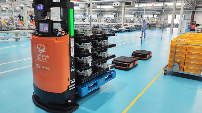 在汽車零部件行業,以重慶青山工業為例,海康機器人助力重慶青山工業打造智能制造新模式。青山工業是中國大型專業變速器生產企業和世界大型微型汽車變速器生產企業之一,專注于汽車傳動系統領域,長期服務長安集團、一汽集團、上汽集團、東風汽車、通用汽車、奇瑞汽車、長城汽車等多家客戶。青山工業投入使用數十臺海康機器人潛伏及叉取AMR,實現多車型混行作業,多導航方式間平滑切換,實現生產車間內零部件存儲、配送的全流程物流自動化。潛伏AMR對清洗件的料車、油底殼專用貨架進行入庫、配送、空料車搬用。叉取AMR完成左右箱體、液壓模塊的入庫、配送上架、返空搬用。海康機器人RCS系統與上層管理系統LES、客戶WCS無縫對接,實現了AMR與箱體出入庫滾筒線、液壓模塊及離合器上料液壓平臺、油底殼機械手等自動化設備的高精度對接,完成資源的統一調度。