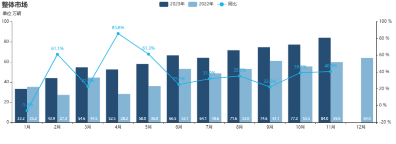 據(jù)中國汽車工業(yè)協(xié)會統(tǒng)計(jì),1-11月,汽車產(chǎn)銷累計(jì)完成2711.1萬輛和2693.8萬輛,同比分別增長10%和10.8%,增速較1-10月分別提升2和1.7個(gè)百分點(diǎn)。至此,2023年前11個(gè)月,汽車產(chǎn)銷量已超過2022年全年(2022年我國汽車產(chǎn)銷分別為2702.1萬輛和2686.4萬輛)。預(yù)測2023年中國汽車銷量或接近3000萬輛,同比增長可能超過10%,超過2017年的2888萬輛創(chuàng)歷史新高。