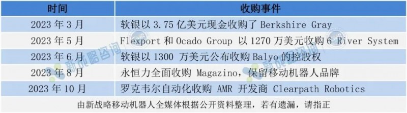 除融資以外,2023年移動機器人收購事件也值得關注。據公開資料顯示,收購事件5起,總收購金額超4億美元(超28億人民幣),最高金額達3.75億美元,其中,軟銀兩度出手,累計斥資近4億美元收購兩家企業。