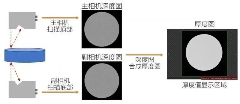 方案優(yōu)勢(shì):通過(guò)雙相機(jī)對(duì)射拼接掃的方式描圓柱體兩個(gè)面,輸出圓柱體“厚度”圖像(兩張深度圖差分形成),在“厚度”圖像中可直接顯示圓柱體任意點(diǎn)位的厚度值,以及兩個(gè)平面的3D數(shù)據(jù)