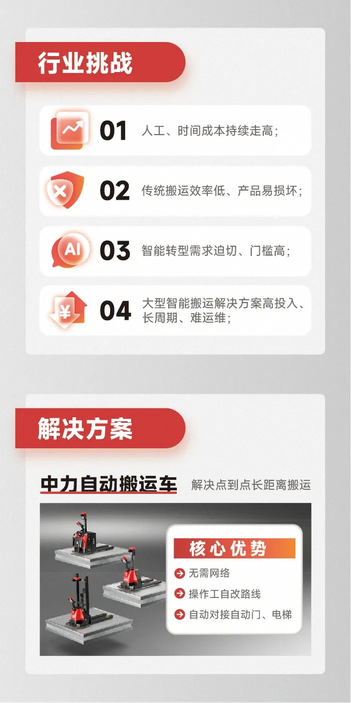 基于對市場的深度洞察,去年以來中力定義行業新概念——自動搬運車,專注解決點到點長距離無效搬運,破解用工難題。基于精準高效的自動配送,中力自動搬運車助力生產效率大幅提升!