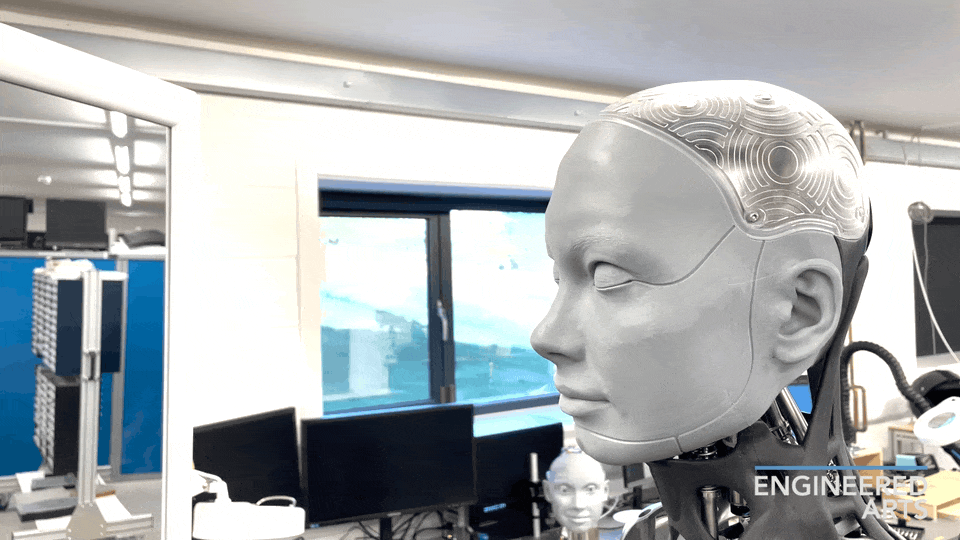 如今,Ameca 不僅能像人一樣控制表情,還有了畫畫、空間識(shí)別、語(yǔ)音克隆等 AI 賦予的能力。
