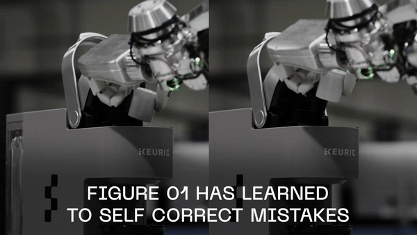 制作過程中,F(xiàn)igure 01 能自主調(diào)整動(dòng)作不準(zhǔn)確的地方(左圖部分),無(wú)需任何人為遠(yuǎn)程遙控。