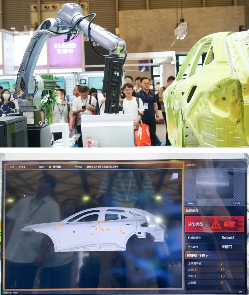 采用海康機器人自研的程控條紋光傳感器進行采圖,對車漆表面的顆粒,漆疤、劃痕、氣泡、針眼等缺陷進行在線全檢,最小可實現(xiàn)0.2mm的缺陷檢測,借助機械臂的柔性,檢測可達性區(qū)域幾乎覆蓋100%車身。