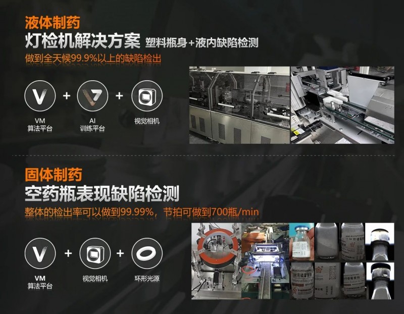 質(zhì)量安全永遠(yuǎn)是制藥領(lǐng)域的第一要求。在液體及固體制藥領(lǐng)域,通過(guò)高分辨率面陣相機(jī)與深度學(xué)習(xí)AI算法的結(jié)合,海康機(jī)器人提供的機(jī)器視覺(jué)解決方案能夠精準(zhǔn)檢測(cè)瓶身外觀缺陷及液內(nèi)異物,大幅提升檢測(cè)準(zhǔn)確率與效率,同時(shí)保障檢測(cè)人員的健康安全。