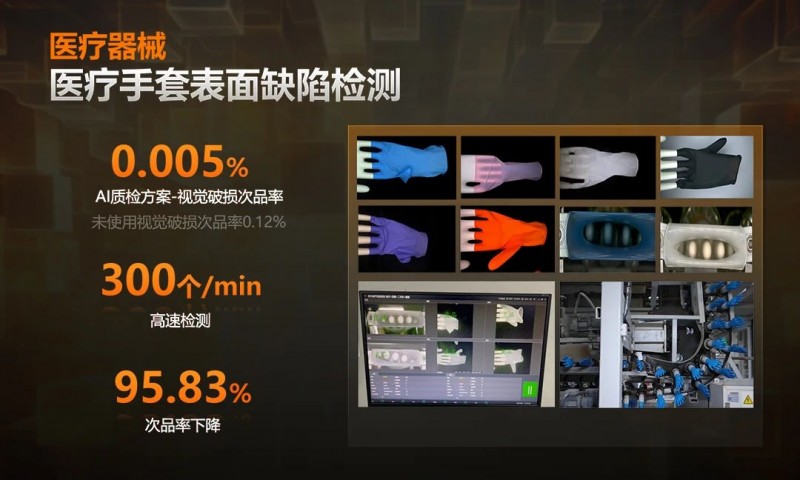 在器械領(lǐng)域醫(yī)用手套表面缺陷檢測(cè)的項(xiàng)目實(shí)踐中,海康機(jī)器人通過(guò)CCD面陣相機(jī)、AI深度學(xué)習(xí)等技術(shù),實(shí)現(xiàn)了綜合缺陷漏檢率小于十萬(wàn)分之五的高精度檢測(cè),大幅提高了產(chǎn)線良率、效率,降低客訴率。