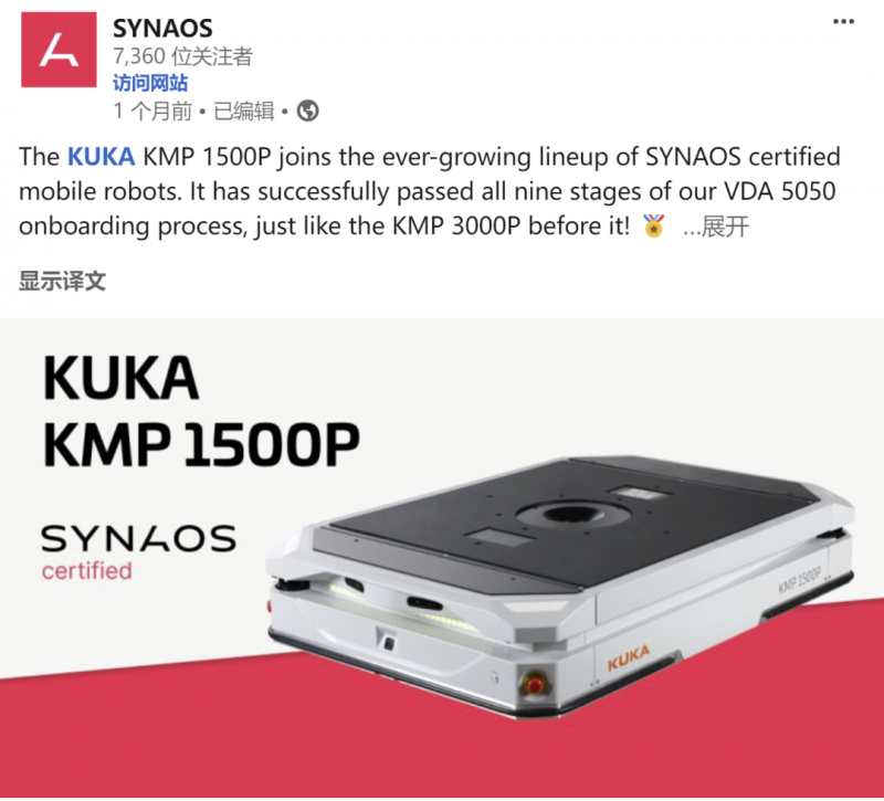 德國SYNAOS公司為世界著名的工業(yè)物流系統(tǒng)開發(fā)集成商。SYNAOS調(diào)度系統(tǒng)采用了現(xiàn)今工業(yè)物流領(lǐng)域主流的VDA 5050 協(xié)議。在SYNAOS公司嚴(yán)格的質(zhì)量要求下,KMP 1500P在實(shí)現(xiàn)了VDA 5050標(biāo)準(zhǔn)協(xié)議的同時,依次通過了SYNAOS 9步質(zhì)量檢測,達(dá)到了認(rèn)證標(biāo)準(zhǔn),現(xiàn)已成為SYNAOS集成項目中可靠的組成部分,并且可以應(yīng)用到更多行業(yè)領(lǐng)域賦能其內(nèi)部物流升級。