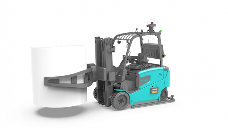 勱微E系列平衡重式無人叉車搭載弧形自適應夾具,夾緊物料后可連續360°旋轉,便于交換作業,廣泛用于造紙、紙箱、包裝、印刷等行業無托盤搬運。