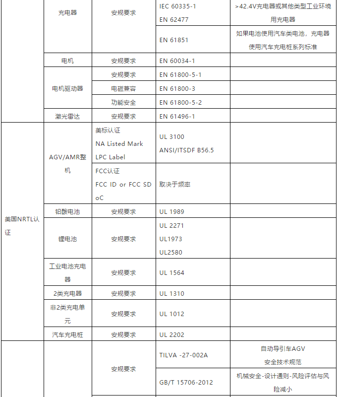 AGV/AMR整機隸屬于機械產品,全球各個國家和地區對于機械產品的進口都有相關法規要求,用以保護人員的健康,財產和環境要求。同時,由于各國技術發展與社會發展水平不同,對于機械產品安全認證要求,從法規標準體系,產品認證范圍,到市場監管體系均不一致,因此機械產品出口到不同的國家與地區,涉及的認證要求不一樣。相應的AGV/AMR所用到的關鍵零部件,對應不同市場也有相應的法規標準要求。