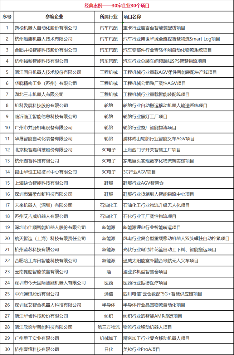 為了更好的宣導(dǎo)和展示從91年國(guó)產(chǎn)AGV落地應(yīng)用以來在各行各業(yè)的經(jīng)典案例,以及將案例與技術(shù)相結(jié)合,凸顯行業(yè)前瞻技術(shù)的論文集萃。中國(guó)移動(dòng)機(jī)器人(AGV/AMR)產(chǎn)業(yè)聯(lián)盟與新戰(zhàn)略移動(dòng)機(jī)器人產(chǎn)業(yè)研究所聯(lián)合出版了《中國(guó)工業(yè)應(yīng)用移動(dòng)機(jī)器人經(jīng)典案例匯編及技術(shù)發(fā)展論文集(2021版)》。具體入選案例名錄如下:
