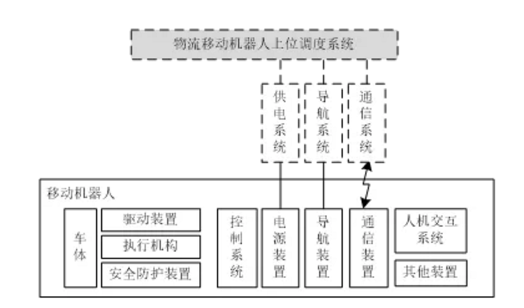 物流移動(dòng)機(jī)器人系統(tǒng)由固定部分與移動(dòng)部分組成。其中,固定部分即地面系統(tǒng)(Stationary system),包括上位調(diào)度系統(tǒng)、導(dǎo)航系統(tǒng)、充電系統(tǒng)及通信系統(tǒng);移動(dòng)部分即為移動(dòng)機(jī)器人單機(jī),包括車體、驅(qū)動(dòng)裝置、導(dǎo)航裝置、通信裝置、車載控制系統(tǒng)、安全防護(hù)裝置、執(zhí)行機(jī)構(gòu)等,如圖1所示。