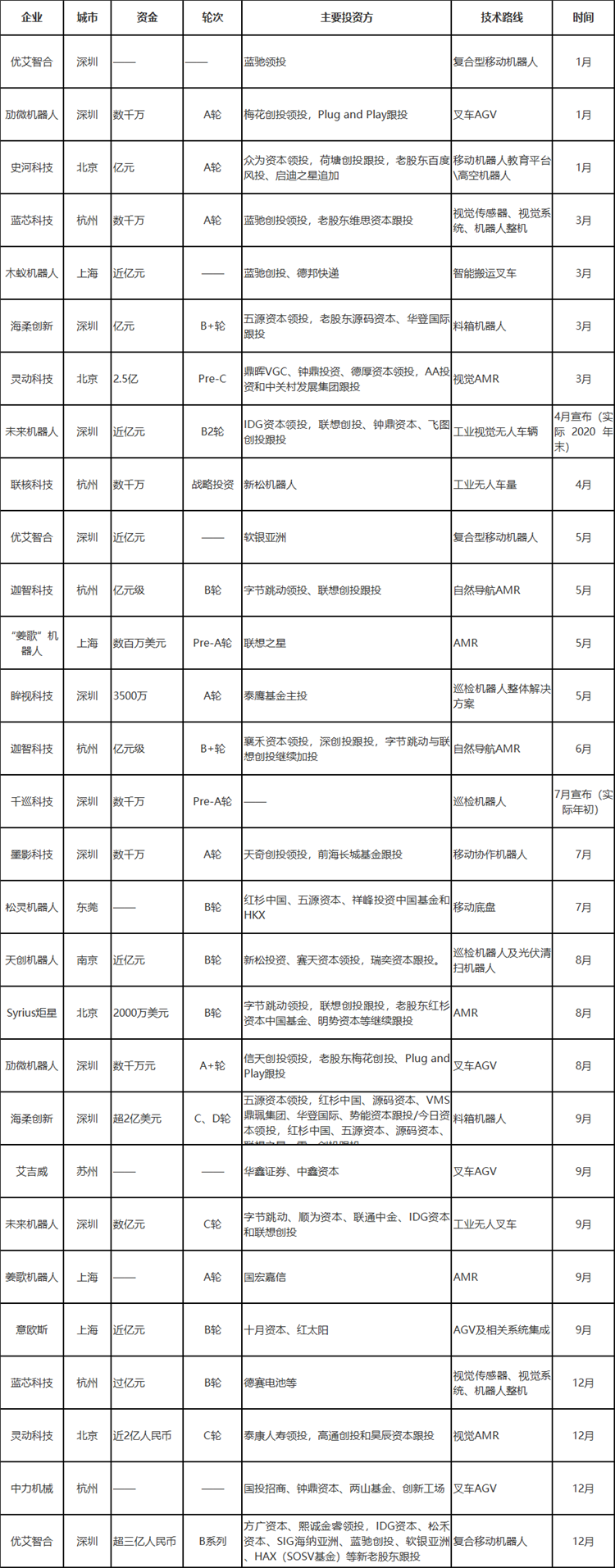表:2021中國工業(yè)應(yīng)用移動機(jī)器人行業(yè)投融資情況(本表根據(jù)企業(yè)公開融資信息統(tǒng)計(jì),如有未完善之處,請指正!)