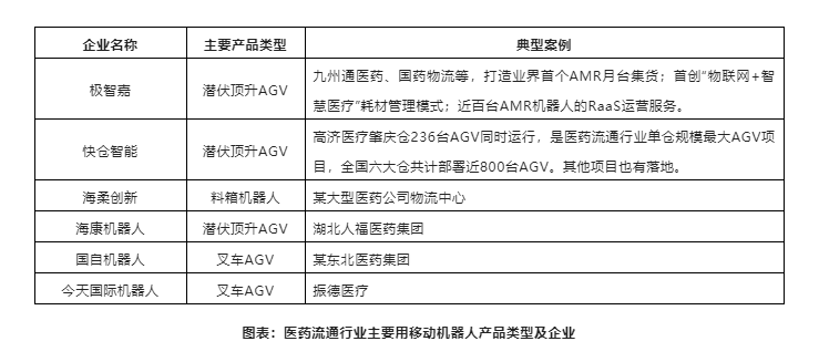 圖表:醫(yī)藥流通行業(yè)主要用移動機器人產(chǎn)品類型及企業(yè)